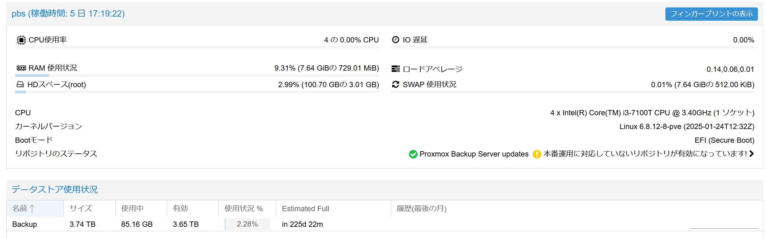 もちろん、Proxmox Backup Serverです。以前は、CT/VMのバックアップはProxmoxのLocalストレージに保存していましたが、限界が見えてきました。ストレージを追加して使ってもみましたが、この際サーバーを増やしてみたいと考えてサーバーを分けることにしました。